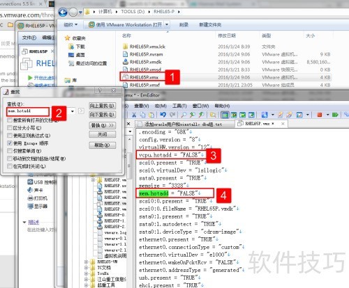 4、 修改虚拟机vmx配置文件,将mem.hotadd参数设为False,可解决相关错误提示问题。
