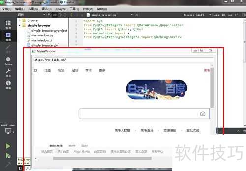 1、 确保已具备一个可正常运行且支持网页功能的项目。若无,可通过百度搜索Qt Creator使用Python开发简易浏览器相关内容,参考教程完成项目搭建并确保程序可顺利执行,效果所示。