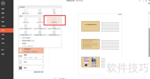 6、 退出讲义母版视图,点击菜单栏文件选项中的打印功能,设置打印布局为每页三张幻灯片的讲义模式。