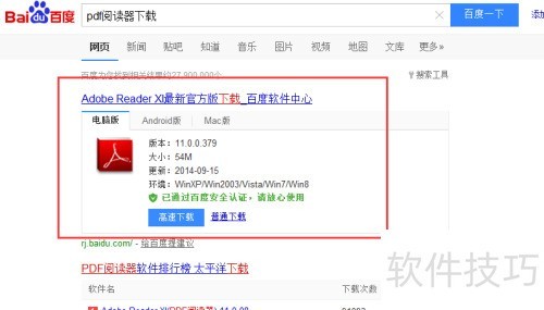 4、 想要阅读电子书,需先下载PDF阅读器。在百度搜索PDF阅读器下载,选择第一个结果中的普通下载链接,完成下载后进行安装即可使用。