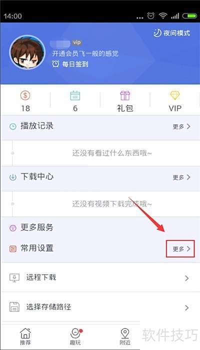 1、 打开手机迅雷应用,登录后(也可跳过登录),点击屏幕右下角的个人中心,进入后找到常用设置选项,点击其后的更多按钮即可进入相关设置页面,无需关注其他内容。