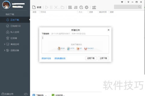 3、 若有电影的BT种子或下载链接,可直接下载。打开迅雷,点击左上角新建,将种子文件或链接复制进去,即可自动开始下载任务。