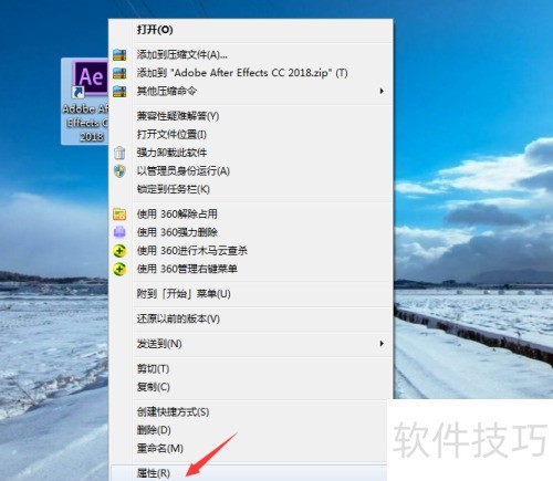 2、 在桌面找到AE图标,右键点击,从菜单中选择属性选项。