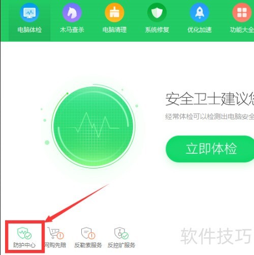 1、 打开360卫士,点击左下角防护中心即可。