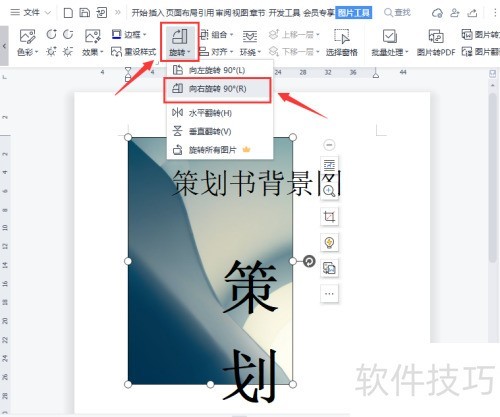 3、 选中图片后,点击旋转功能中的向右90度选项。