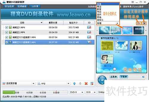 2、 在软件主界面可直接选用系统提供的各类光盘菜单模板,设置后可在预览窗口实时查看效果。用户亦可根据需要选择关闭菜单功能,灵活定制光盘界面布局。