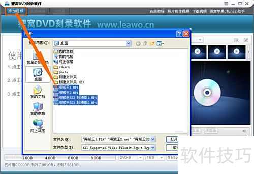 1、 打开狸窝刻录软件,界面简洁,操作指引清晰。点击左上角的添加视频按钮,通过文件浏览功能找到并选择海贼王的MP4视频文件,将其导入软件。该软件支持多种视频格式,几乎无需转换,任何常见格式的视频都能直接添加并进行刻录,使用方便快捷,适合各类用户轻松完成光盘制作。