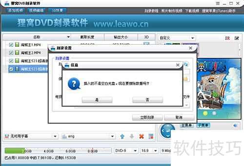5、 开始DVD刻录操作。完成设置后即可启动刻录。将空白刻录盘放入光驱即可直接写入;若使用可重复擦写的旧光盘,系统在点击立即刻录时会自动检测盘内数据。如发现原有内容,将弹出提示询问是否擦除,确认后继续刻录。操作界面所示。