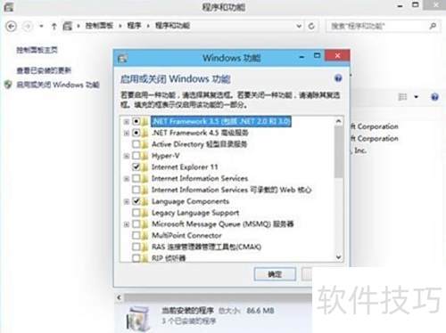 6、 检查安装是否成功:进入控制面板,打开启用或关闭Windows功能,确认.NET Framework 3.5是否已安装并勾选启用。