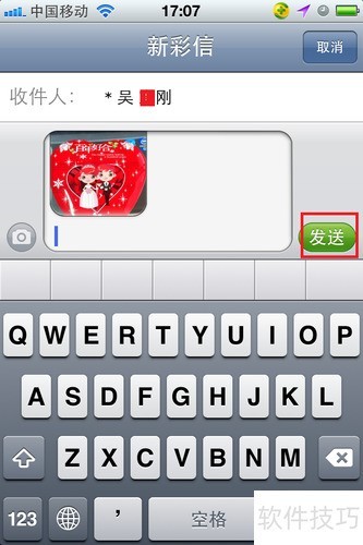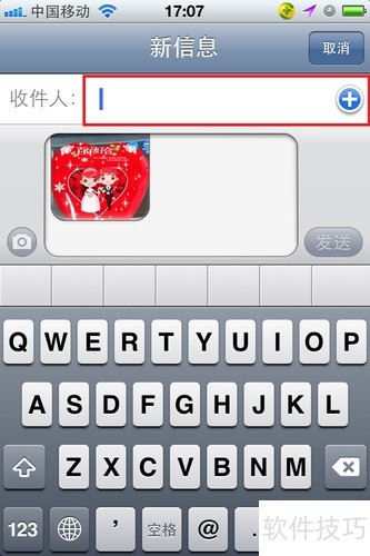 12、 所示,已将图片选为彩信内容。请填写收件人信息,或点击收件人栏的+号添加新联系人。