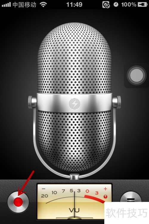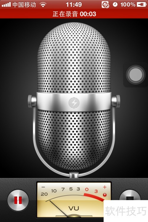2、 点击左侧红色圆点开始录音,录音时左侧双竖线为暂停按钮,右侧方块为停止按钮,点击方块即可结束录音。