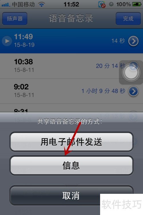 3、 点击右侧三条横线图标即可播放刚录制的音频。界面下方设有共享按钮,支持手机间传输。点击后会显示两个选项:通过电子邮件发送,或选择信息功能以彩信方式发送给他人,操作简便快捷。