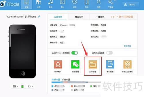 5、 启动iTools后,首页会显示手机信息,找到文件管理选项并点击进入即可。