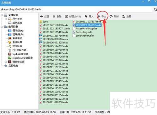 6、 在左侧菜单中找到语音备忘录并点击,即可查看按日期排列的录音文件,选择所需录音,点击导出按钮完成操作。
