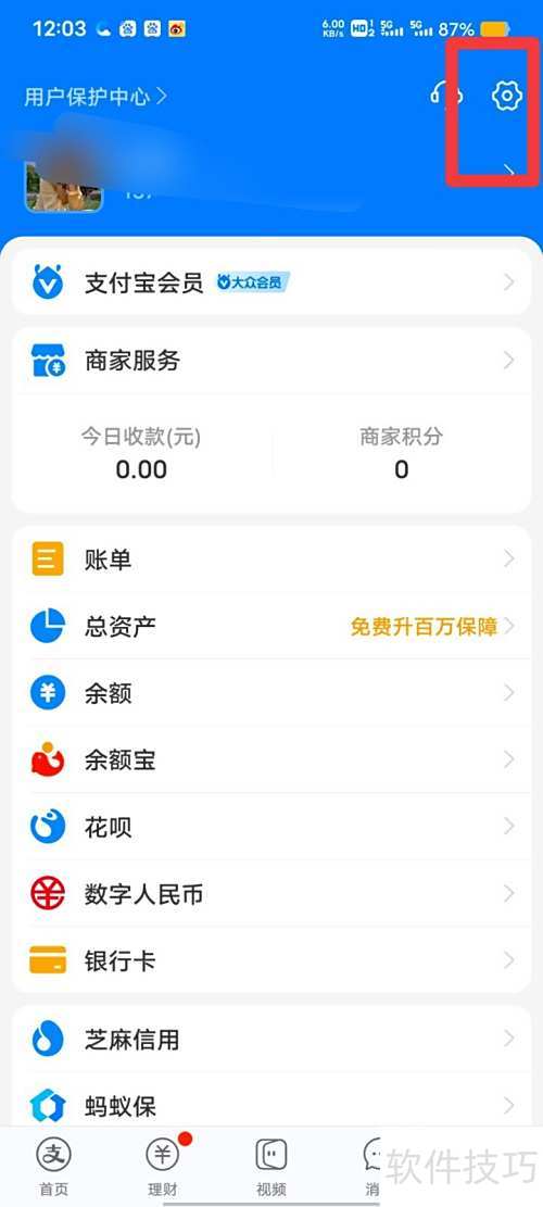 1、 打开支付宝,进入我的页面,点击右上角设置选项。
