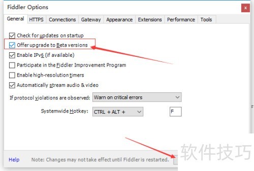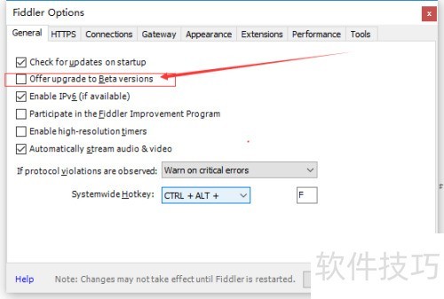 5、 打开 Fiddler 设置,取消勾选提供升级到测试版选项即可。