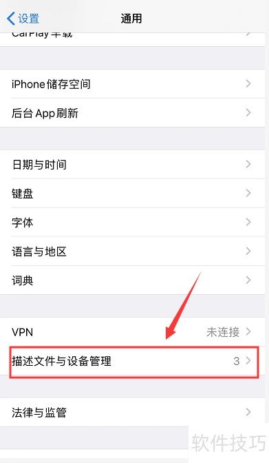 3、 点击通用界面中的描述文件与设备管理,进入相应设置,所示。