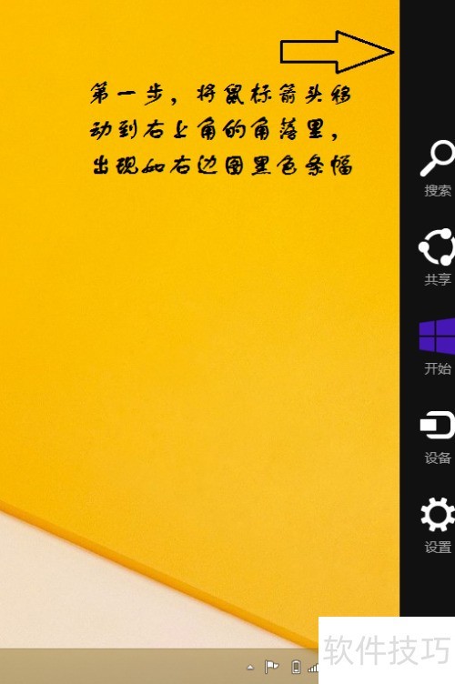 1、 进入Windows 8.1系统后,将鼠标移至右上角角落,黑色菜单栏随即弹出,所示。