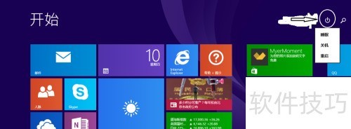 5、 进入Windows 8.1磁贴界面后,点击右上角电源图标,会弹出三个可选操作。