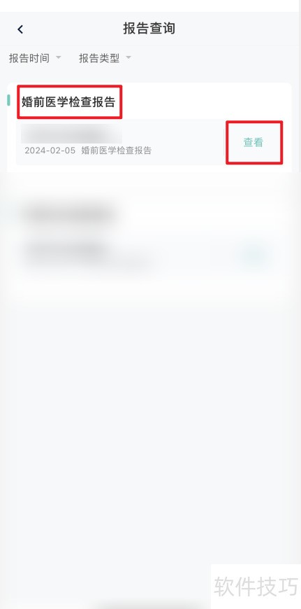 3、 进入报告查询页面,选定婚前医学检查报告,点击查询按钮即可查看结果。