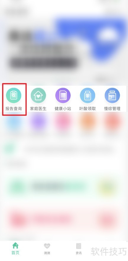 1、 打开医站到家应用,首页选择报告查询功能。