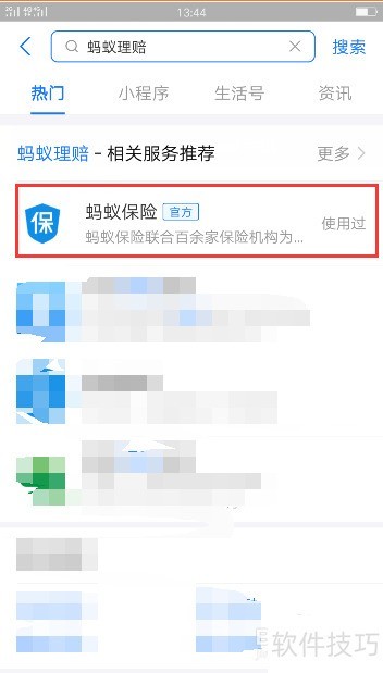 2、 在搜索框输入蚂蚁理赔进行查询