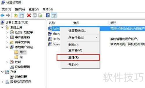 4、 右键单击Administrator账户,然后从菜单中选择属性进行设置。