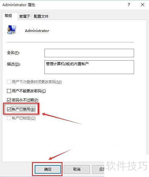 5、 勾选账户已禁用,随后点击确定。