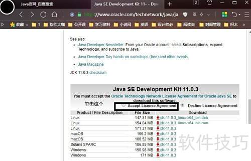 2、 向下滚动页面找到JAVA选项(一所示),点击进入JAVA SE。此时页面会显示多个版本供选择,包括最新版和其他版本(二)。选择所需版本(例如JAVA 11.0.3),点击DOWNLOAD按钮,进入下载页面(三所示)。