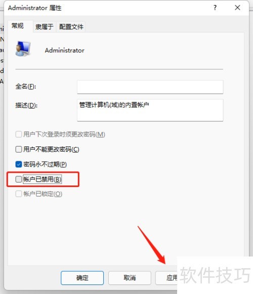 10、 取消勾选帐户已禁用,点击应用后重启电脑,即可激活Administrator账户。