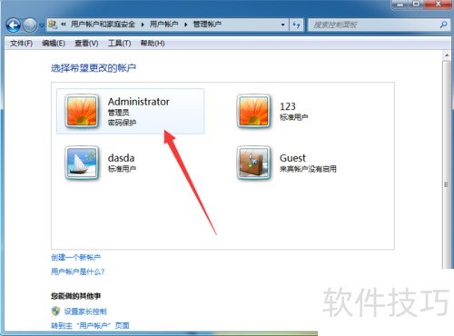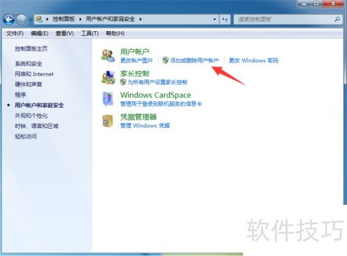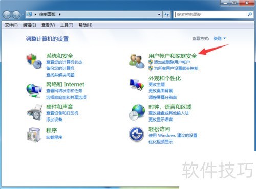 3、 在控制面板中选择用户账户和家庭安全选项,操作所示。