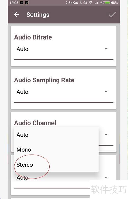 4、 第三项为音频声道设置,包括单声道和立体声,一般推荐选择立体声。