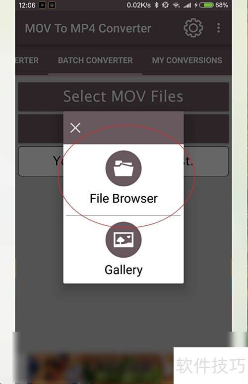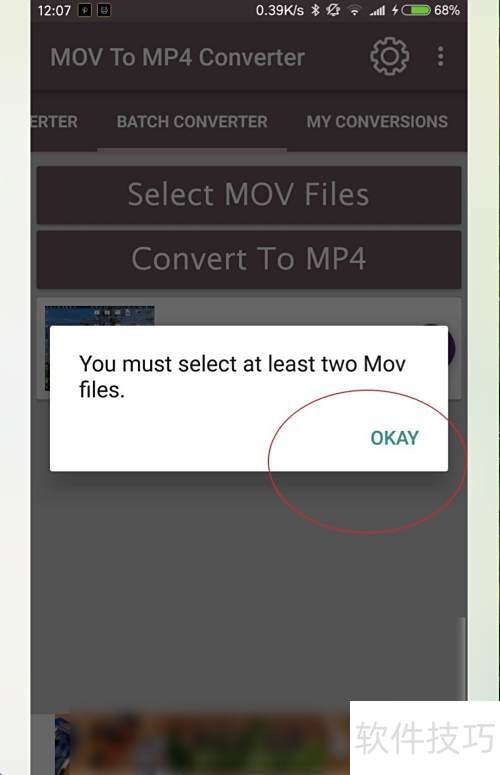 9、 选择手机中的mov文件后,点击select添加第二个文件,重复此操作完成添加。注意批量转换时至少需添加两个视频,否则将出现提示无法转换。待所有视频添加完成后,点击to MP4按钮,即可开始转换为MP4格式。