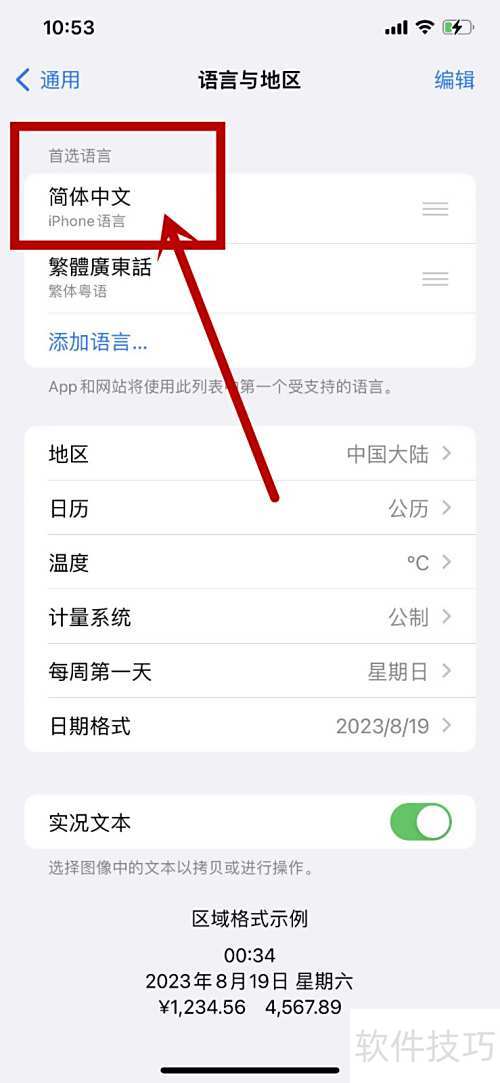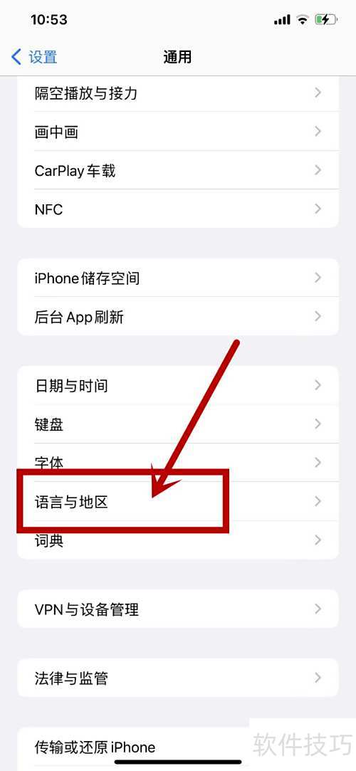 2、 进入手机设置,点击语言与地区,选择简体中文即可。