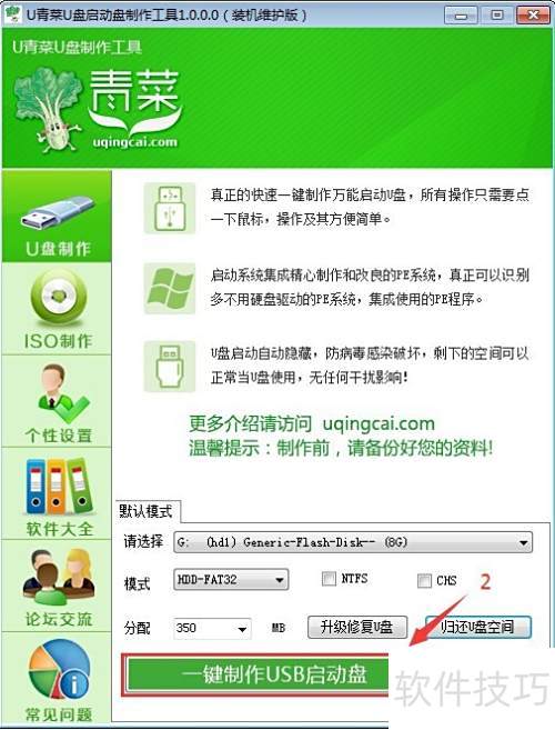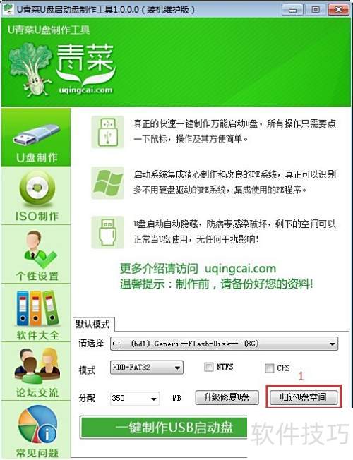 1、 打开青菜U盘软件,点击归还U盘空间功能即可释放存储。