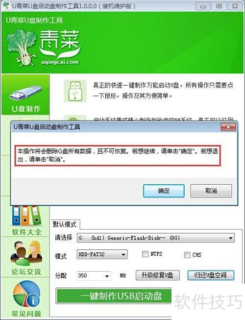 3、 警告:此操作将永久清除G盘所有数据,无法恢复。
