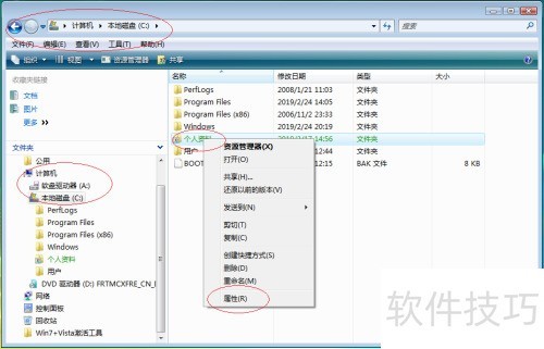 4、 ,右键点击个人资料文件夹,从弹出菜单中选择属性,并进入本地磁盘(C:)目录。