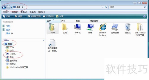 3、 打开Windows 资源管理器窗口,点击左侧桌面→计算机文件夹,展开目录结构,所示。