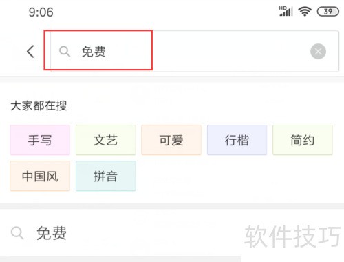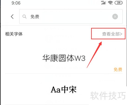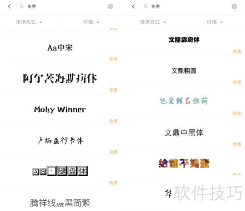 2、 在搜索栏输入免费并点击查看全部,即可找到近60种可选用的字体,虽然缺乏特别华丽的款式,但日常使用已足够满足需求。