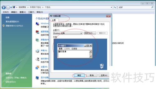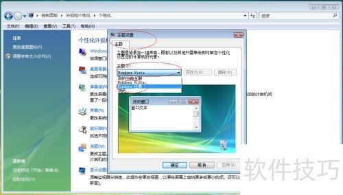 6、 所示,打开主题设置对话框,点击主题→主题文本框的下拉箭头,在列表中选择Windows 经典即可。
