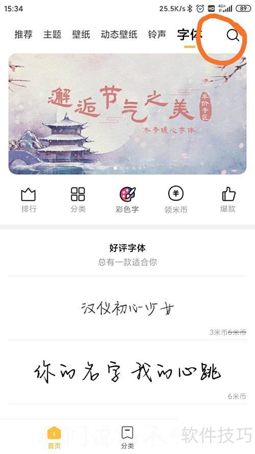 3、 选择心仪字体后,可点击右上角搜索功能进行查找。