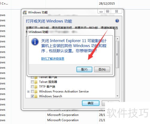 5、 打开Windows功能对话框,找到并勾选Internet Explorer 11选项,根据需要选择对应版本进行卸载操作。