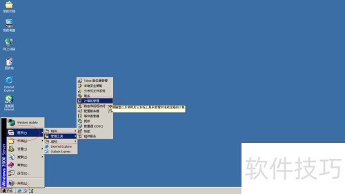 1、 启动Windows 2000 Server系统,点击任务栏的开始菜单,依次进入程序、管理工具,然后选择计算机管理选项。