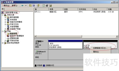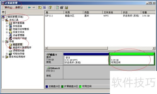 2、 打开计算机管理界面,点击存储→磁盘管理,接下来将执行扩展磁盘分区的创建操作。