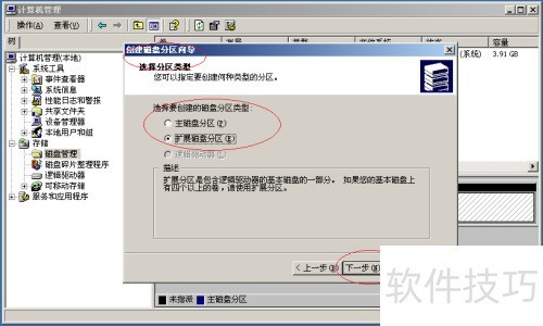 4、 ,打开新建磁盘分区向导窗口,选中扩展磁盘分区选项,完成设置后点击下一步继续操作。