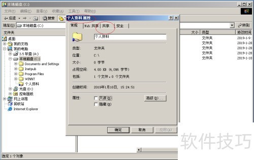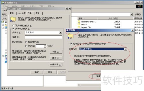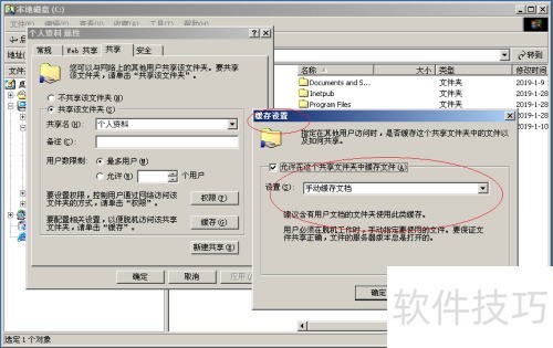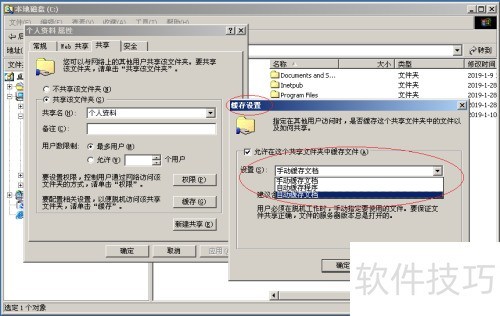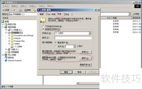 4、 进入个人资料属性,切换至共享标签,点击共享文件夹并启用缓存功能。