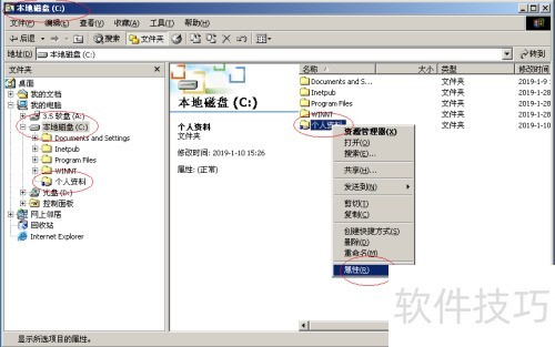 3、 右键点击本地磁盘(C:)→个人资料文件夹,选择属性选项。