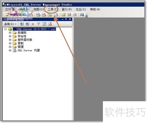 2、 在已安装数据库的服务器上启动SQL Server Management Studio,随后选择并点击工具选项。
