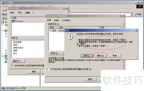 5、 出现通讯录访问控制设置窗口后,取消选中允许父级继承权限传递至该对象选项。