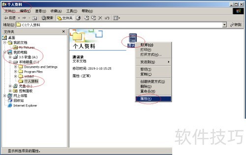 3、 右键点击本地磁盘(C:)→个人资料→通讯录图标,从菜单中选择属性。
